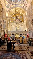 Войда внутрь, мы попадаем в буквально пронизанный светом интерьер храма, где в верхней части апсиды Богоматерь Знамение окружена словами молитвы «Милосердия двери отверзи нам, Благословенная Богородице»