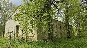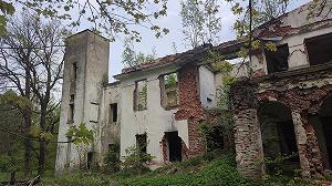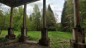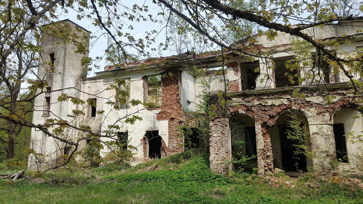 Дворовый фасад усадебного дома украшен трехарочным кирпичным портиком, потихоньку местность вокруг зарастает подлеском.