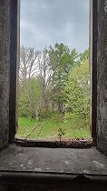 В окно видны одноэтажные служебные постройки, симметрично расположенные по бокам главного дома.