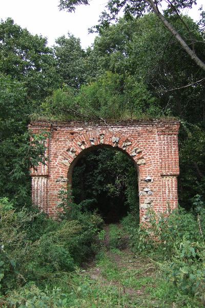 Старые ворота из красного кирпича с белокаменной отделкой ведут в запущенный парк.