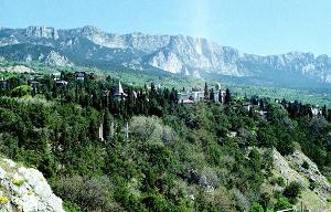 Над утопающем в зелени городком парят в воздухе белые вершины Ай-Петри.
