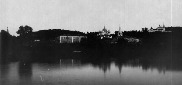 Так живописно выглядел Гороховец в начале ХХ века. Расположенный в Волжско-Окском междуречье на правом высоком берегу реки Клязьма, городок сохранил свое уютное очарование и в наши дни. Вид с реки на центральную часть города за сто лет почти не изменился.