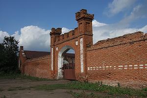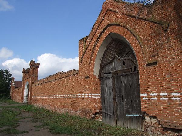 Конный двор, выстроенный в псевдоготическом стиле, и впрямь хорош. Можно залюбоваться на его кирпичные стены, украшенные зубцами башенки, деревянные ворота. Можно залюбваться, а можно пойти дальше мимо руин главного дома вниз к реке...