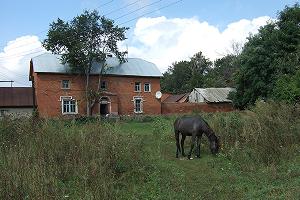 Выйдя к его боковому фасаду, умиляешься пасущимся лошадкам. Будто все - как прежде. Каре конного двора правда огораживает живущую внутри машино-тракторную текнику. Но все как-то мило, по-домашнему.