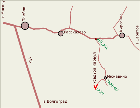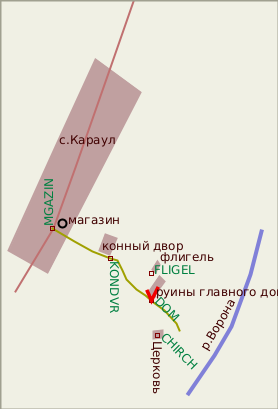 Из Москвы проще всего добираться по волгоградскому шоссе до Тамбова, далее на Рассказово и Кирсанов (по этому шоссе можно доехать на восток до Саратова). Между Рассказовым и Кирсановым поворот направо на Инжавино (путевая точка 2INZHA). В Инжавинском районе дорога плохая, сильно выбитый асфальт (2006 г.) Проехав Инжавино, нужно повернуть правее (путевая точка 2KARAU), на Караул. Въехав (и почти проехав насквозь) село Караул, сразу за магазином (он будет слева), поворот налево (путевая точка MAGAZIN) на проселочную дорогу, уводящую в лес (точнее, это сильно заросший парк усадьбы). Машину лучше оставить у поворота - усадьба совсем недалеко. Первым слева оказывается конный двор (KONDVR) - единственная из построек усадьбы, здравствующая и поныне. Ворота закрыты, внутри какая-то техника, вид жилой и довольно приличный. Дальше проселок выводит к наиболее сохранившемуся крылу главного дома (DOM), проходит мимо него и в густой чаще начинает спускаться вниз к реке. Спустившись немного вниз, можно заметить отходящую от проселка вправо-вверх тропу - к церкви (CHIRCH). GPS-трек приведен от поворота на Инжавино с шоссе Тамбов-Рассказово-Кирсанов до усадьбы.