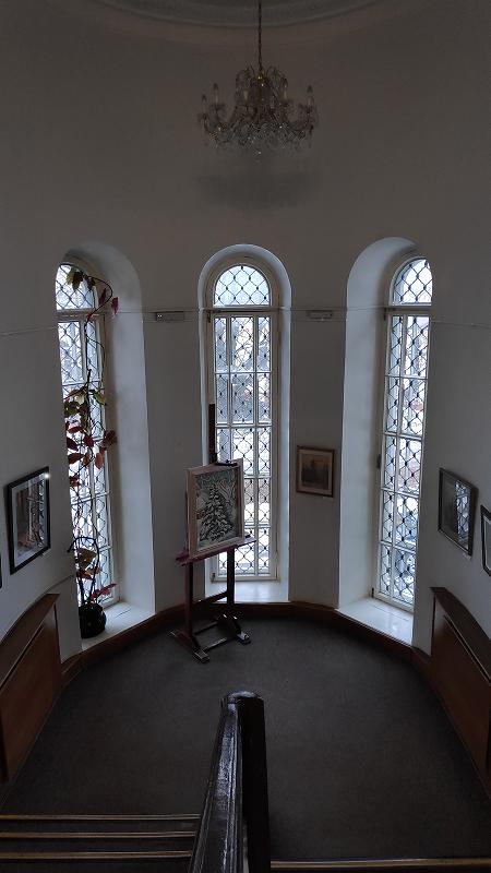 В полукруглой башенке сохранилась старая лестница, вытянутые арочные окна придают торжественность интерьеру.
