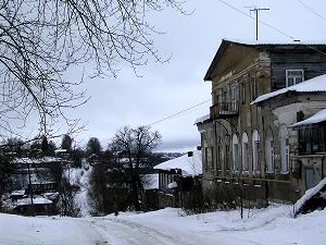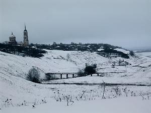 На крутом спуске со Старого Посада неожиданно открылась панорама реки и города. Таким он нам и запомнился - в голубых снегах над Окой...