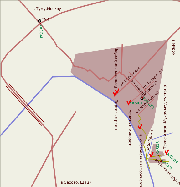 В самом Касимове ориентироваться по современной карте - одно удовольствие, и героические подвиги наших предшественников, осваивавших город по "картам" советского образца, вызывают уважение и сочувствие. Сложности, правда, были: в январе 2005 года сильные снегопады сделали многие мелкие улицы совсем непроезжими (мы вообще не уверены, что по всем изображенные на карте улицам можно ездить). Довольно много улочек с односторонним движением, но знаки развешены кое-как, и не все их соблюдают. Самый серьезный сюрприз ожидал нас у гостиницы. При попытке припарковаться поближе ко входу, под снежным "бордюром" обнаружился замаскированный люк, крышка которого как будто закрывалась, но наступать или наезжать на нее было нельзя: она проваливалась, выбирая ось вращения по своему усмотрению. Будьте внимательны!