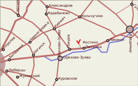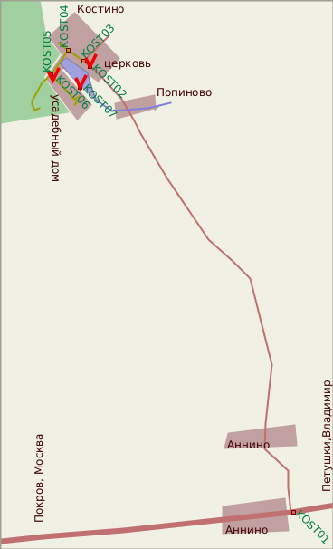 По шоссе Москва-Владимир, между Покровом и Петушками, в конце деревни Аннино поворот налево (путевая точка KOST01). Дальше - по местному шоссе. В самом Костине сначала справа будет церковь (KOST02), затем само шоссе делает резкий правый поворот (KOST03), а прямо продолжается деревенская улица. По этой улице нужно доехать до современного здания школы (оно будет справа) и здесь повернуть(KOST04) налево, а оказавшись на другой стороне пруда, еще раз налево , на улицу дачного поселка (точка KOST05, прямо - дорога в лесхоз). Сразу после поворота справа можно увидеть усадебный дом, точнее, то, что от него осталось. Дальше по улице, немного не доезжая до ее конца, будет ответвление влево-вниз в сторону пруда, по нему можно дойти до сохранившегося строения на берегу, предположительно школы-конторы (KOST07). Это строение хорошо было видно еще с шоссе, при подъезде к Костину.