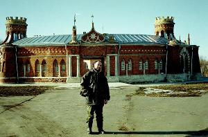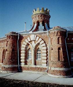 Сама же усадьба действительно великолепна и необычна для Рязанщины. Сам усадебный дом скрыт в зелени разросшегося парка. Своими псевдоготическими формами и пустыми окнами он сильно напоминает Царицыно. Но самое интересное ждет нас впереди. Пройдя по аллее, наискосок от дома к мосту между прудами, не веришь глазам своим. Впереди на полуострове - то ли стилизованная турецкая крепость, то ли круглый псевдоготический замок в миниатюре. Удивительное сооружение! Увидев его воочию, не возникает сомнений в авторстве В.И.Баженова. Только он с его полетом фантазии и свободным владением формой мог это придумать. А ведь это - скотный двор. Такое можно увидеть только раз в жизни, очень советуем не пропустить! Правда, сейчас этот памятник федерального значения выглядит несколько приватизированным. Машины с московскими номерами, колокольчик у крыльца (у скотинки крыльца-то наверно не было), но в целом состояние постройки хорошее, даже очень хорошее. Что подтверждает внушающим уважение лаем бегающая на длинной цепи огромная псина. Не пугайтесь, собачка добрая, здание можно обойти кругом, полюбоваться окошками и башенками, не будучи покусанным. Места здесь очень симпатичные. Хорошо, наверно, живется в скотном дворе...