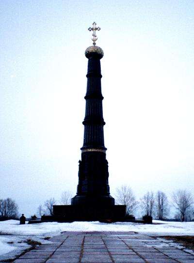 Рядом с храмом,на открытой вершине холма, стоит обелиск, построенный намного раньше - в 1849-1850 годах А.П.Брюлловым.