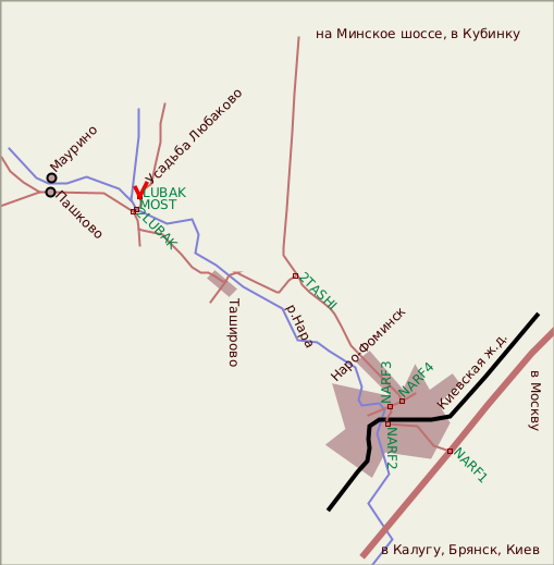 До Любанова (или Любакова - как правильно, так и не удалось понять) можно добраться от Москвы по Минскому или Киевскому шоссе. Последний вариант показан на схеме. Заблудиться можно только в Наро-Фоминске (мы постарались отобразить все значимые повороты в городе и привести соответствующие GPS-точки). Усадебный дом расположен слева от шоссе и хорошо виден. В целом дороги соответствуют распространенным крупномасштабным картам, однако дорога непосредственно от Любакова на север, вероятно, тупиковая: по мере продвижения она становилась все хуже, и мы повернули назад.