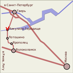 Микулино Городище расположено на шоссе Тверь-Волоколамск, примерно посередине, на границе Тверской и Московской области.