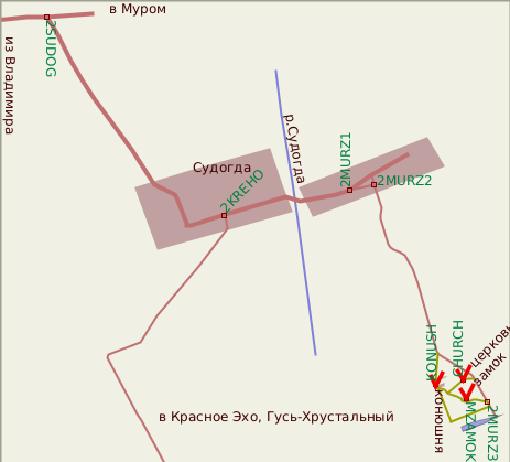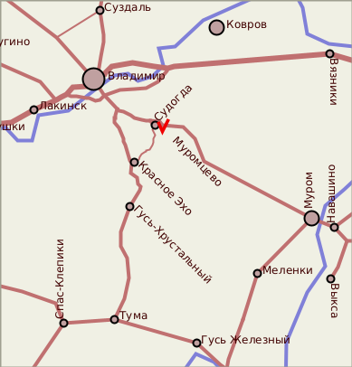 От Владимира по шоссе на Муром около 50 километров, затем поворот (путевая точка 2SUDOG) с основной трассы на Судогду. Проехав большую часть города и переехав по мосту речку Судогда, в том месте, где главная дорога уходит чуть левее (2MURZ1), нужно продолжить движение прямо по местной улочке с односторонним движением. Улочка упирается (2MURZ2) в шоссе, ведущее к Муромцеву. Через пару километров шоссе отклоняется левее, а прямо, по еще более узкой дороге - подъезд к конному двору усадьбы, стоящему несколько в стороне от основных построек. Чтобы попасть к самой усадьбе, лучше проехать немного дальше по шоссе, огибающему слева деревню и усадебный парк. Не доезжая мостика через ручей (он протекает через усадебные пруды) нужно свернуть (2MURZ3) вправо на дорожку под вывеску какого-то техникума над железными воротами. Дорожка подводит прямо к замку и продолжается дальше, до конного двора. Примерно посредине между усадебным домом и конным двором перекресток, от которого другая дорога ведет к церкви и, далеее, опять на шоссе.