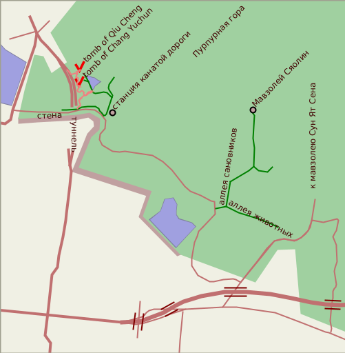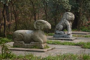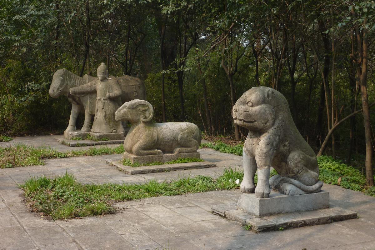 Однако главные достопримечательности Нанкина находятся за пределами стены, у подножия Пурпурной горы. Это захоронения времен самого начала эпохи Мин (1368-1644). Аллея с каменными скульптурами животных, реальных и мифических, переходит в аллею, по сторонам которой установлены скульптуры маршалов и гражданских сановников. Далее священный путь подимается вверх по склону горы и завершается мавзолеем основателя минской династии императора Чжу Юаньчжана (Хун Ву)