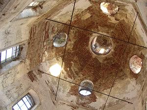 Восьмерик с красивым куполом, увенчанный маленьким восьмеричком с луковицей, выглядит изнутри довольно ажурно.