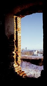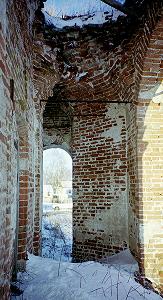 От колокольни на второй этаж рядом стоящей церкви ведет слегка обвалившаяся лесница-пандус. Трехпролетная конструкция не кажется переутяжеленной, скорее наоборот.