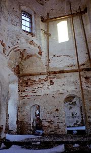 Нижняя теплая церковь сохранилась лучше. Несмотря на то, что она использовалась под скотный двор, здесь сохранились росписи, почти не разрушены стены.