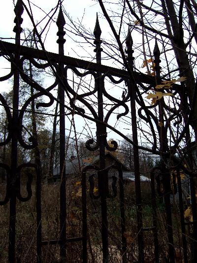 Когда-то были в усадьбе и въездные ворота, и парадный двор. Сохранилась красивая кованная решетка с элементами модерна. Служебные постройки вокруг не слишком выразительны.