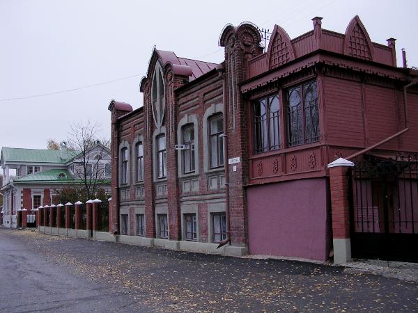 Следом за ним - дача фабриканта Павлова, пример плесского модерна. Кирпичное здание дополнено резной деревянной верандой с изящными витражами. Раньше следующим на набережной стоял деревянный дом с мезонином,принадлежавший братьям Шемякиным. Теперь на его месте кирпичный новорусский особнячок, выдержаный в старых формах.