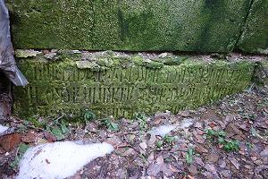 Основание колокольни (северо-западный угол) покоится на перевернутой вверх ногами древней погребальной плите.