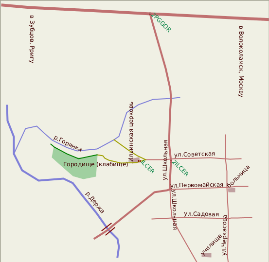 Глубокий овраг (или ров) соединял Держу и Горянку, препятствуя проникновению на территорию Городка. Сейчас сюда ведет дорога - дорога на современное кладбище.