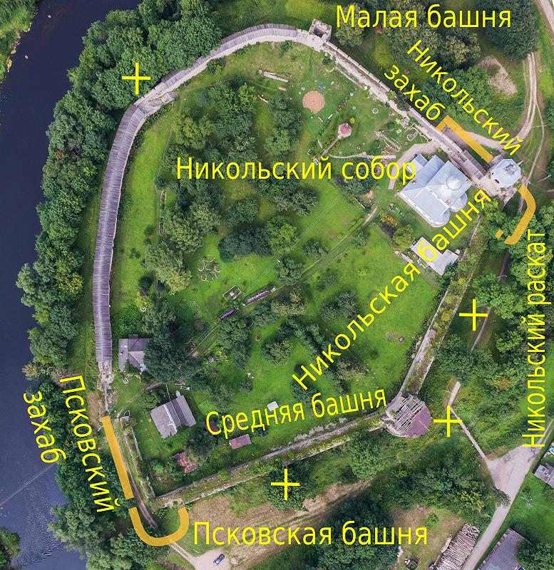 Чтобы было понятно, о чём идёт речь, приведём аэрофото Порховской крепости (взятое отсюда), на котором мы схематически нанесли не дошедшие до наших дней стены и башни, по мотивам реконструкции А.Н.Кирпичникова [Кирпичников, 1984, с.227]. Сейчас единственный гарантированный вход в крепость - через Никольский захаб, с северо-востока. Он был основным входом в крепость и в древности, Псковский играл вспомогательную роль. Внешние стены обоих захабов разрушены, на виду остались только внутренние. Нет сейчас и Псковской башни в юго-западном "речном" углу крепости. Прочие башни как таковые сохранились, хотя и с определёнными потерями. Так, перед внешними воротами Никольской башни в 1445–1475 годах был устроен так называемый Никольский раскат, своеобразный "предзахаб" с площадкой для артиллерии. От раската остались лишь нижние ряды кладки стены ниже нынешнего уровня земли. На схеме также отмечены места расположения настенных крестов, можно попробовать их обнаружить, гуляя под стенами крепости снаружи, если строительные леса, заборы и прочие атрибуты реставрации не помешают.