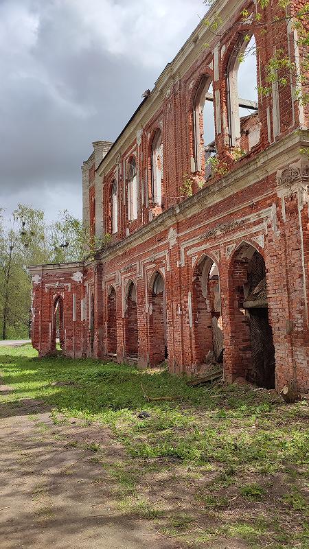 Формально увадратное здание кажется не совсем симметричныым, а вытянутым в сторону церкви. Широкие окна давали много света, а сейчас прямо доходят до основания. Дом врос в землю, а кирпич потихоньку растаскивают для хозяйственных нужд.