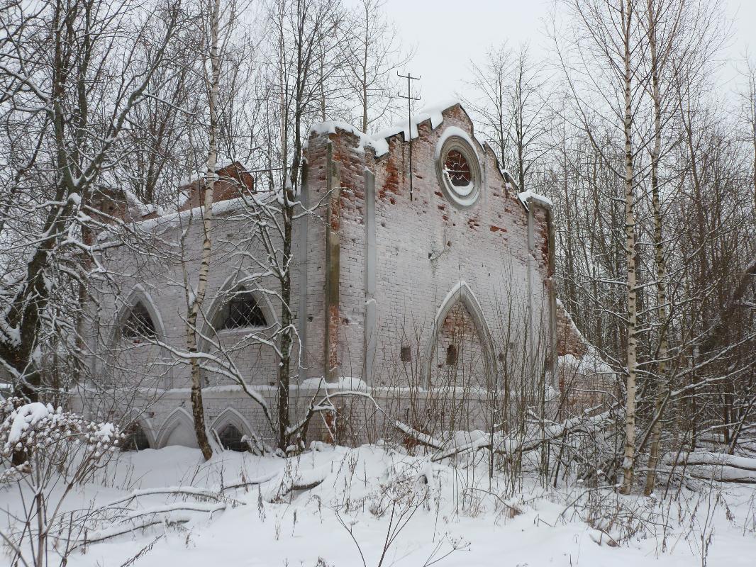 Позади сгоревшего главного дома сохранились каменные хозяйственные постройки в псевдоготическом стиле. Они не используются и постепенно рушатся.