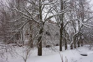 Вокруг - заросший парк (преимущественно из лип, кленов и елей) с остатками прудов. За круглым прудом располагались кирпичные остекленные оранжереи.