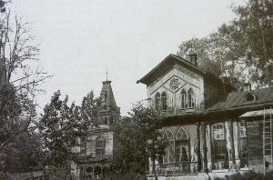 Сама деревянная усадьба не сохранилась, и о ее внешнем виде можно судить лишь по фотографиям. Главный дом соединялся с флигелями закругленными галереями, ограничивая парадный двор с фонтаном в центре.