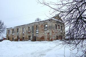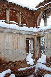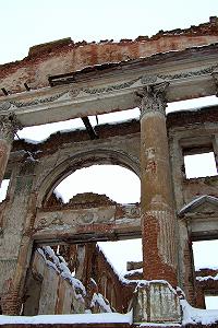 Внутри здание совершенно разрушено, кирпич осыпается под ногами. Кое-где видны позднейшие перестройки (заложеные палладианские окна).