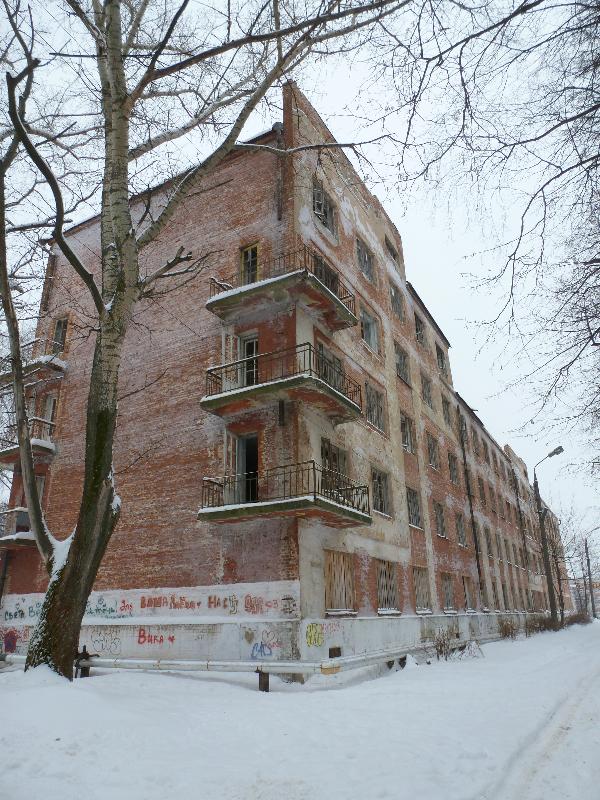 А почти напротив усадьбы Жинкина, среди деревьев, расположен памятник совсем другой эпохи - конструктивистский жилой дом РЖСКТ имени Арсения, возведенный в конце 20-х годов XX века. Возможно, по нынешим стандартам дом не вполне удобен - в первоначальном проекте квартиры предусматривались с санузлами, но без ванн. Очень хочется надеятся, что современное состояние памятника связано с предстоящей реконструкцией, а не сносом здания.