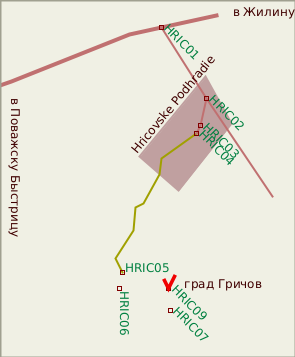 Современный поселок Гричев и град Гричев - это не одно и то же. Ближайшая к замку деревня - Гричевское Подградье, в которую можно попасть, свернув с шоссе Жилина - Поважска-Быстрица, идущему по левому берегу Вага,на местную асфальтированную дорогу. В деревне поворот направо (кажется, первый). По узкой асфальтированной улице, переходящей в проселочную дорогу, можно проехать к подножию горы, на которой расположен замок. Дорога идет сначала по лугу (при сомнениях нужно держаться левее, но придерживаться накатанной колеи), затем, у подножия горы, входит в лес, как бы по дну оврага. Здесь, на перекрестке проселков, можно оставить машину (только не загораживайте проезд, здесь ездят на телегах). Чуть дальше по дороге в скале слева вы увидите небольшую пещеру искусственного происхождения, рядом - навес. От этого места налево ответвляется тропа к граду. Подъем занимает минут 10-15.