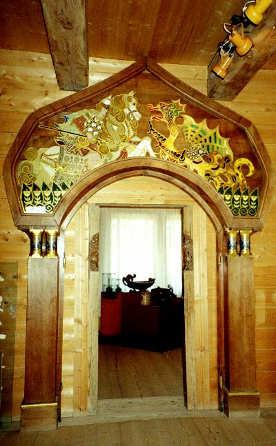 Внутри - свидетельства художественной жизни Талашкина. Сюда приезжали музыканты, артисты, художники. Многие из них подолгу гостили и работали в усадьбе: А.Н.Бенуа,М.А.Врубель, К.А.Коровин, А.А.Куренной, М.В.Нестеров, А.В.Прахов, И.Е.Репин, Я.Ф.Ционглинский. Репин и Коровин написали В Талашкине портреты хозяйки - М.К.Тенишевой.