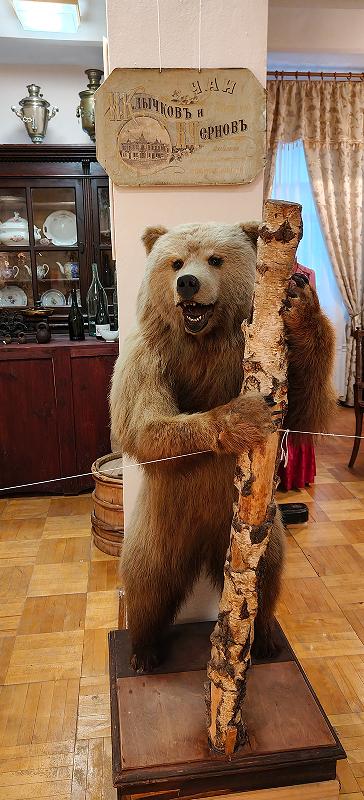 Советское время внесло свои коррективы, поднос у мишки забрали и дали в лапы ствол березки, чтобы включить в общезвериную экспозицию. Однако сейчас этот красавец стоит все же не среди собратьев, а опять при трактирных экспонатах.