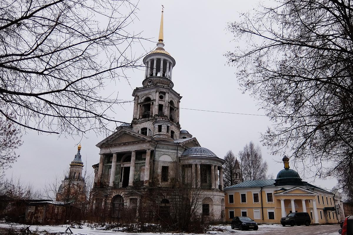 Наконец, вот оно, самое знаменитое чудо города. Продолжая наш путь по правому берегу на юг, оставив слева Верхнее городище и поднявшись на гору по Старицкой улице, мы оказываемся перед Спасской церковью-колокольней Борисоглебского монастыря. Замысел её проекта обычно приписывается Н.А.Львову. Но, как известно, Львов умер в конце 1803 года (по старому стилю), то есть до постройки колокольни (1804 - 1811). Кто же подготовил её окончательный проект и осуществлял, как сейчас говорят, авторский надзор? До недавнего времени считалось, что фамилия этого человека - Ананьин, а вот кто он такой, существовали две с половиной версии. По одной из них, им был местный "архитектор-самоучка" Фёдор Ананьин, что никак не вяжется с явно профессиональным проектом, пожалуй, сложноватым даже для самого Львова, тяготевшего к более простым и строгим формам. По второй версии (её в 80-х годах XX века выдвинул нижегородский историк Н.Ф.Филатов) этим человеком был бывший губернский архитектор Нижнего Новгорода Яков Ананьин. Профессионализм последнего не вызывает сомнений, но уж слишком фантастично выглядела не подкрепленная никакими документами история его переселения (после отставки) из Нижнего ко Львову в Черенчицы для занятий землебитными строениями.