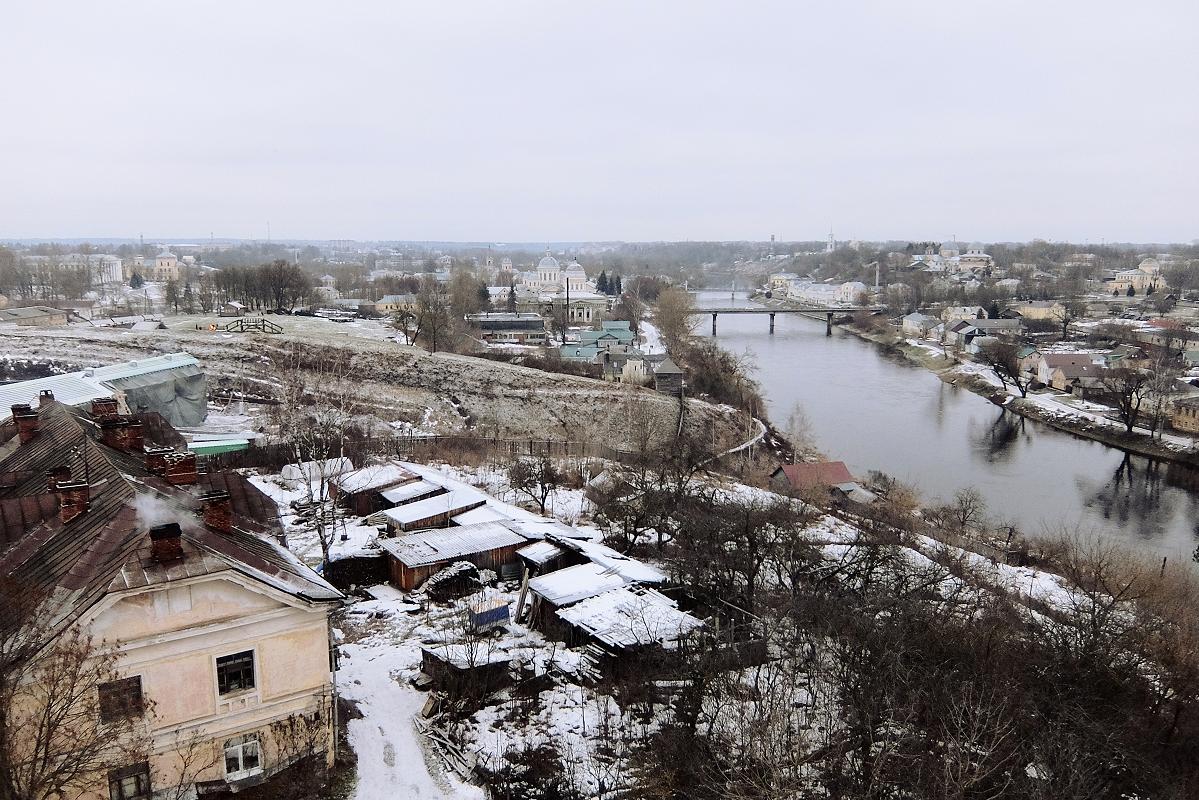 Вид с колокольни - незабываемый. Внизу, сразу за крышами сараев - травянистый холм Верхнего городища. Дальше, в низине, слева от автомобильного моста - Входоиерусалимский и Спасопреображенский соборы.