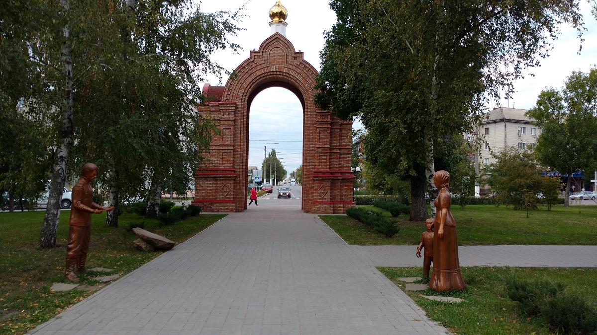 Рядом восстановлена (на новом месте) арка в честь явления иконы Урюпинской Божьей Матери (разрушенное большевиками аналогичное строение было посвящено импереторской семье). Перед аркой опять же скульптурная композиция, на этот раз деревянная - памятник казакам, не вернувшимся с войны, а также недождавшимся их женам и детям. Скульптуры установлены по инициативе и на средства местного казачества.