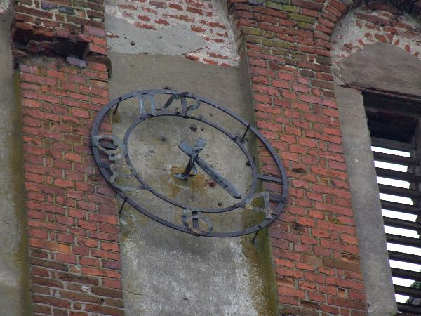 Символичны часы, единственная уцелевшая стрелка которых остановилась на четырех. Наверно, тогда остановилось время для старого замка и кирхи.