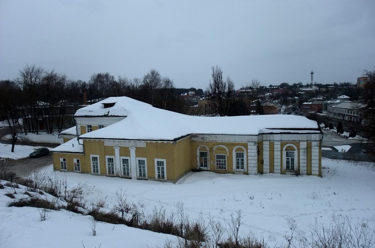 Прямо перед земляными валами стоит еще одно интересное здание начала ХХ века, выстроенное в стиле неоклассицизма. Дом украшен белыми пилястрани, над которыми расположен довольно выразительный фриз.