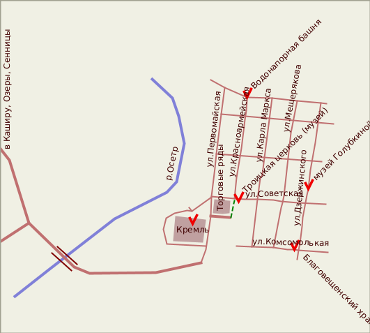 На высоком берегу реки Осетр, при слиянии с речкой Монастыркой, в 1528-1531 годах по указу великого князя Василия III был построен Кремль. Это редкий для Руси пример "регулярной" крепости.