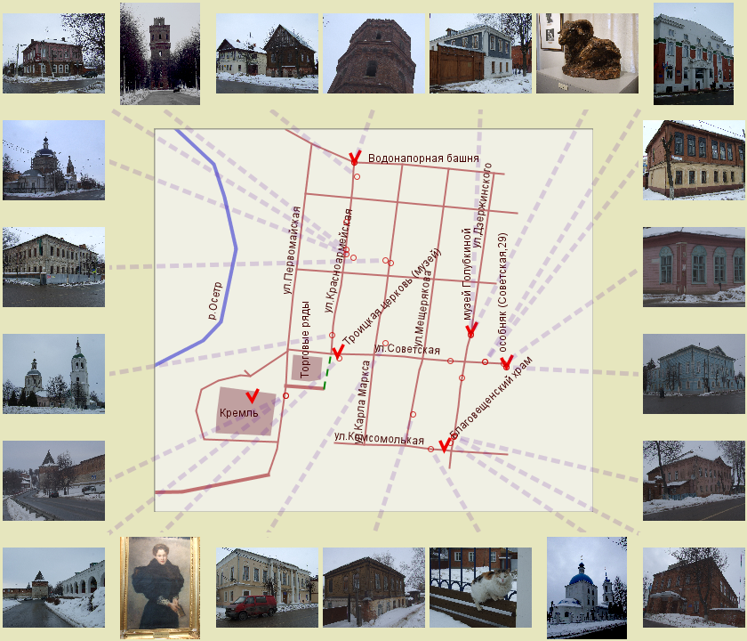 Зарайск. Интересное название города располагает к размышлениям. Кажется, что где-то далеко, далеко за райскими кущами, за Раем, стоит чудный город Зарайск. Городок и впрямь симпатичный, но название свое получил от слова "заразиться". Когда-то стояло на высоком берегу реки Осетр село Красное, принадлележало оно в начале XIII века Федору Юрьевичу - сыну рязанского князя. Но в 1237 году пришли сюда татары, и жена князя Евпраксия, не желая попасть в плен, взяв на руки малолетнего сына, бросилась вниз с высокого терама и "заразилась" (убилась). Так гласит легенда. В XVI веке город вошел в состав Московского княжества, как и другие рязанские земли. Став окраиным городом княжества, он взял на себя функцию охраны от татарских набегов. Появились земляные валы, рвы, деревянные стены с пятью проездными и семью глухими башнями (Острог). Внутри Острога построена каменная крепость. В 1608 году город захвачен польско-шляхетскими отрядами Лисовского. Постепенно Зарайск теряет оборонное значение и превращается в крупный торговый центр. В 1778 город получает герб, регулярный план и становится уездным центром Рязанского наместничества (позже губернии). В это время начинается экономический расцвет Зарайска, начинает реализовываться проект перепланировки, возникают богатые, преимущественно кирпичные, постройки в центре города. К концу XVIII века здесь кроме крепости насчитывается 29 каменных строений. К середине XIX века город полностью сформирован, но сильнейший пожар 1860 года уничтожил почти все деревянные здания. Классицистический облик города был дополнен постройками, выполненными в духе эклектики. По счастью, в советское время центр города не понес значительных утрат, а новое строительство развернулось на окраинах. Нынешний Зарайск - приятный тихий город с сохранившейся одно- и двух- этажной застройкой. В центре - старый Кремль, Гостиный двор, торговая площадь. А вокруг симпатичные улочки, по которым не устаешь гулять, любуясь уютными домиками с деревянной резьбой.