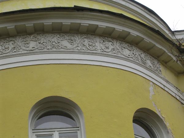 Декоративная лепнина покрывает фризы центральных участков стен обоих фасадов. Особенно изящно смотрится она на полукруглом выступе стены, обращенной к парку.
